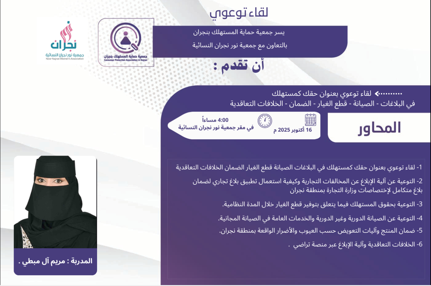 التوعية بحقوق المستهلك فيما يتعلق بتوفير قطع الغيار خلال المدد النظامية، والتوعية عن الصيانات الدورية وغير الدورية، والخدمات العامة في الصيانة المجانية.